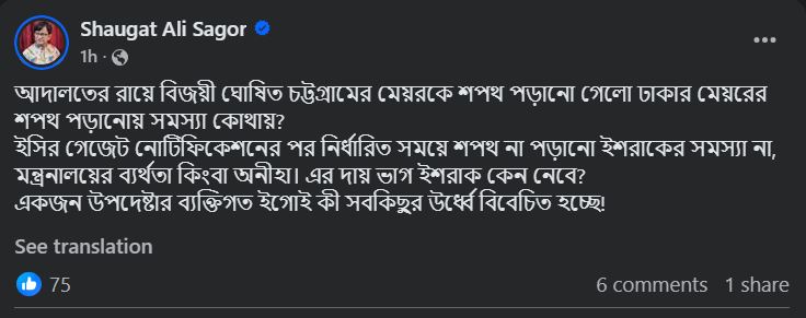 শওগাত আলী পোস্টে লিখেন, ‘ইসির গেজেট নোটিফিকেশনের পর নির্ধারিত সময়ে শপথ না পড়ানো ইশরাকের সমস্যা না, মন্ত্রণালয়ের ব্যর্থতা কিংবা অনীহা। এর দায় ভাগ ইশরাক কেন নেবে?’