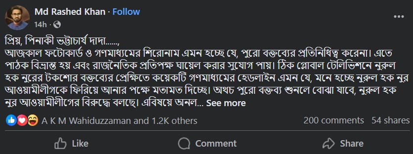 পিনাকী ভট্টাচার্য দাদা একজন জ্ঞানী মানুষ, তার প্রতি আমার অনুরোধ থাকবে, হেডলাইন বা ফটোকার্ড দেখেই সিদ্ধান্ত নেবেন না। পুরো সংবাদ বা বক্তব্য পড়ে মন্তব্য করবেন। আপনি বিদেশ থেকে লড়াই করেছেন। মনে রাখবেন নুরুল হক নুর জুলাই গণঅভ্যুত্থানে অ্যারেস্ট হন এবং ১০ দিন রিমান্ডের পর কোর্টে তুললে ২ আগস্ট তিনি ঘোষণা দেন ৯০% সরকারের পতন হয়ে গেছে, ১০% ধাক্কা দেন।