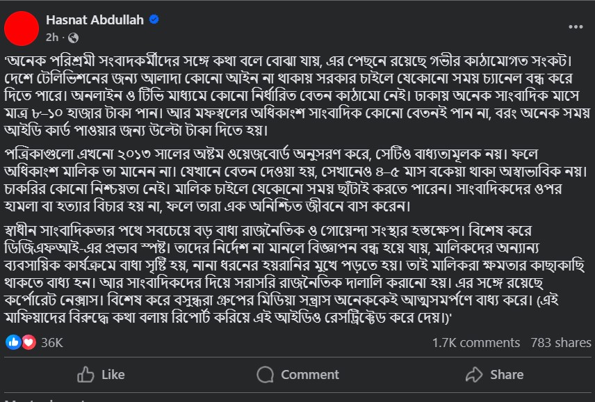 পোস্টে হাসনাত আবদুল্লাহ লেখেন—‘অনেক পরিশ্রমী সংবাদকর্মীদের সঙ্গে কথা বলে বোঝা যায়, এর পেছনে রয়েছে গভীর কাঠামোগত সংকট। দেশে টেলিভিশনের জন্য আলাদা কোনো আইন না থাকায় সরকার চাইলে যেকোনো সময় চ্যানেল বন্ধ করে দিতে পারে। অনলাইন ও টিভি মাধ্যমে কোনো নির্ধারিত বেতন কাঠামো নেই। ঢাকায় অনেক সাংবাদিক মাসে মাত্র ৮–১০ হাজার টাকা পান। আর মফস্বলের অধিকাংশ সাংবাদিক কোনো বেতনই পান না, বরং অনেক সময় আইডি কার্ড পাওয়ার জন্য উলটো টাকা দিতে হয়।