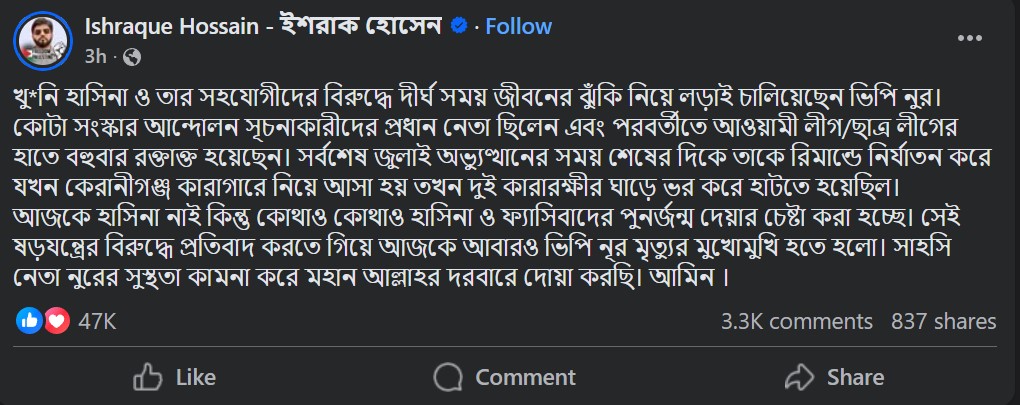 পোস্টে ইশরাক লেখেন, ‘খুনি হাসিনা ও তার সহযোগীদের বিরুদ্ধে দীর্ঘ সময় জীবনের ঝুঁকি নিয়ে লড়াই চালিয়েছেন ভিপি নুর। কোটা সংস্কার আন্দোলন সূচনাকারীদের প্রধান নেতা ছিলেন এবং পরবর্তীতে আওয়ামী লীগ/ছাত্র লীগের হাতে বহুবার রক্তাক্ত হয়েছেন। সর্বশেষ জুলাই অভ্যুত্থানের সময় শেষের দিকে তাকে রিমান্ডে নির্যাতন করে যখন কেরানীগঞ্জ কারাগারে নিয়ে যাওয়া হয় তখন দুই কারারক্ষীর ঘাড়ে ভর করে হাঁটতে হয়েছিল।