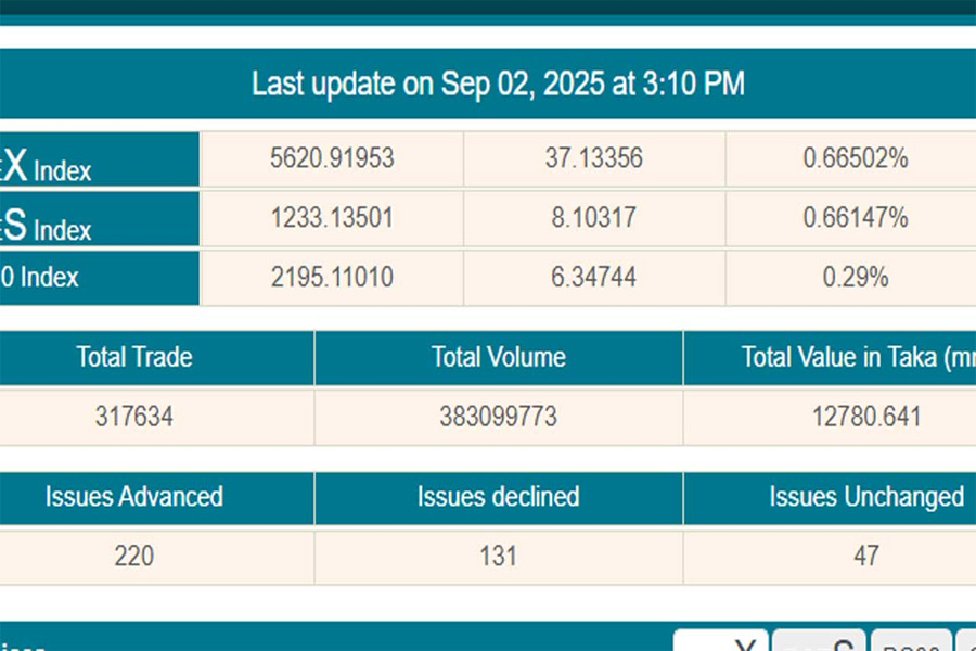দেশের প্রধান পুঁজিবাজার ঢাকা স্টক এক্সচেঞ্জে (ডিএসই) সপ্তাহের তৃতীয় কার্যদিবস মঙ্গলবার (২ সেপ্টেম্বর) সূচক ও লেনদেন দুই ক্ষেত্রেই ঊর্ধ্বমুখী প্রবণতা দেখা গেছে। এদিন ডিএসইর প্রধান মূল্যসূচক ডিএসইএক্স ১১ মাস পর আবারও ৫ হাজার ৬০০ পয়েন্টের ঘর অতিক্রম করেছে।