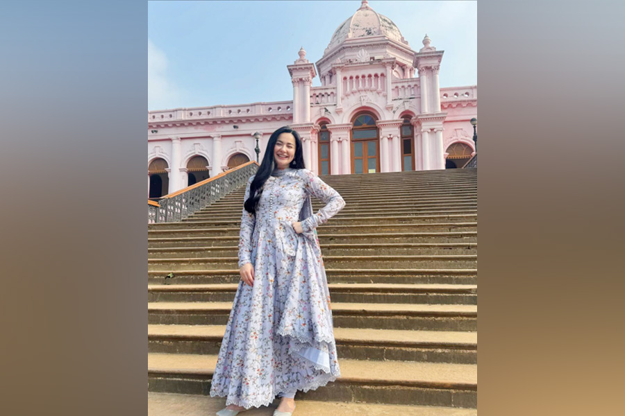 হালকা বেগুনির স্যালোয়ারে হানিয়ার ঘন-কালো চুল নজর কাড়ে, যদিও তার হেয়ারস্টাইল নিয়ে কিছু ভক্ত প্রশ্ন তুলেছেন। আহসান মঞ্জিলের সিঁড়িতে পোজ দিয়ে ছবি তোলেন তিনি, সঙ্গে থাকেন তার টিম, আয়োজক পক্ষ ও অন্যান্য ইনফ্লুয়েন্সার। একটি গ্রুপ সেলফিও তোলেন হানিয়া, যা ভক্তদের মধ্যে আলোচনার বিষয় হয়ে উঠেছে।
