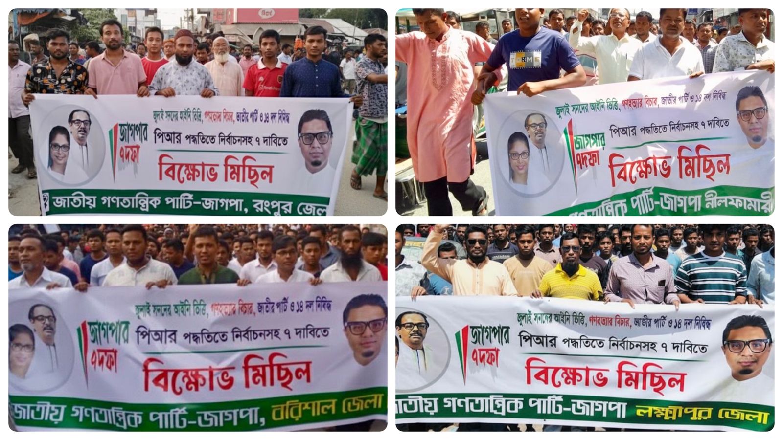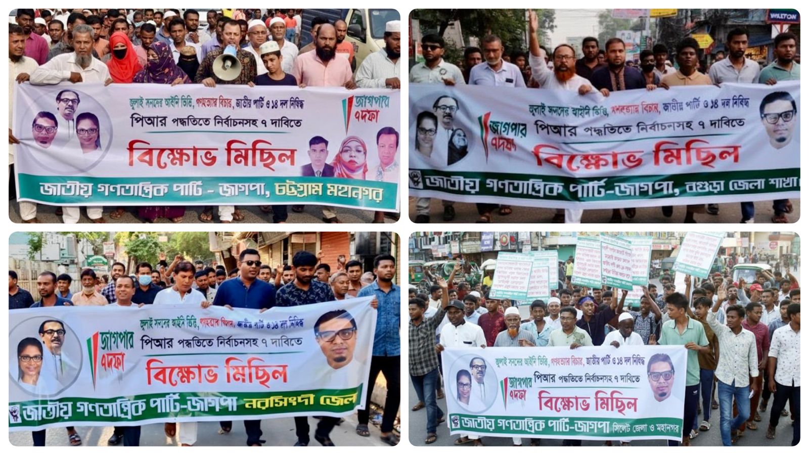 জুলাই সনদের আইনি ভিত্তি, গণহত্যার বিচার, জাতীয় পার্টি ও ১৪ দল নিষিদ্ধ, পিআর পদ্ধতিতে নির্বাচনসহ ৭ দাবিতে দেশের ২০ জেলায় বিক্ষোভ মিছিল করেছে জাতীয় গণতান্ত্রিক পার্টি- জাগপা।