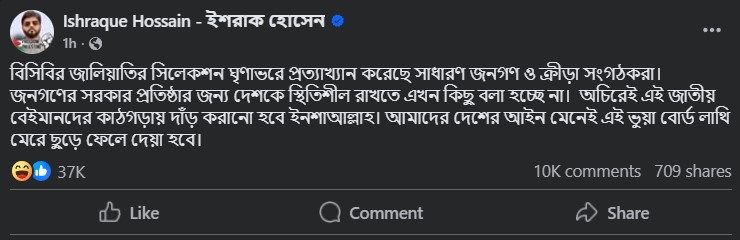 ইশরাক লিখেছেন, ‘বিসিবির জালিয়াতির সিলেকশন ঘৃণাভরে প্রত্যাখ্যান করেছে সাধারণ জনগণ ও ক্রীড়া সংগঠকরা। জনগণের সরকার প্রতিষ্ঠার জন্য দেশকে স্থিতিশীল রাখতে এখন কিছু বলা হচ্ছে না। অচিরেই এই জাতীয় বেইমানদের কাঠগড়ায় দাঁড় করানো হবে ইনশাআল্লাহ। আমাদের দেশের আইন মেনেই এই ভুয়া বোর্ড লাথি মেরে ছুড়ে ফেলে দেয়া হবে।’