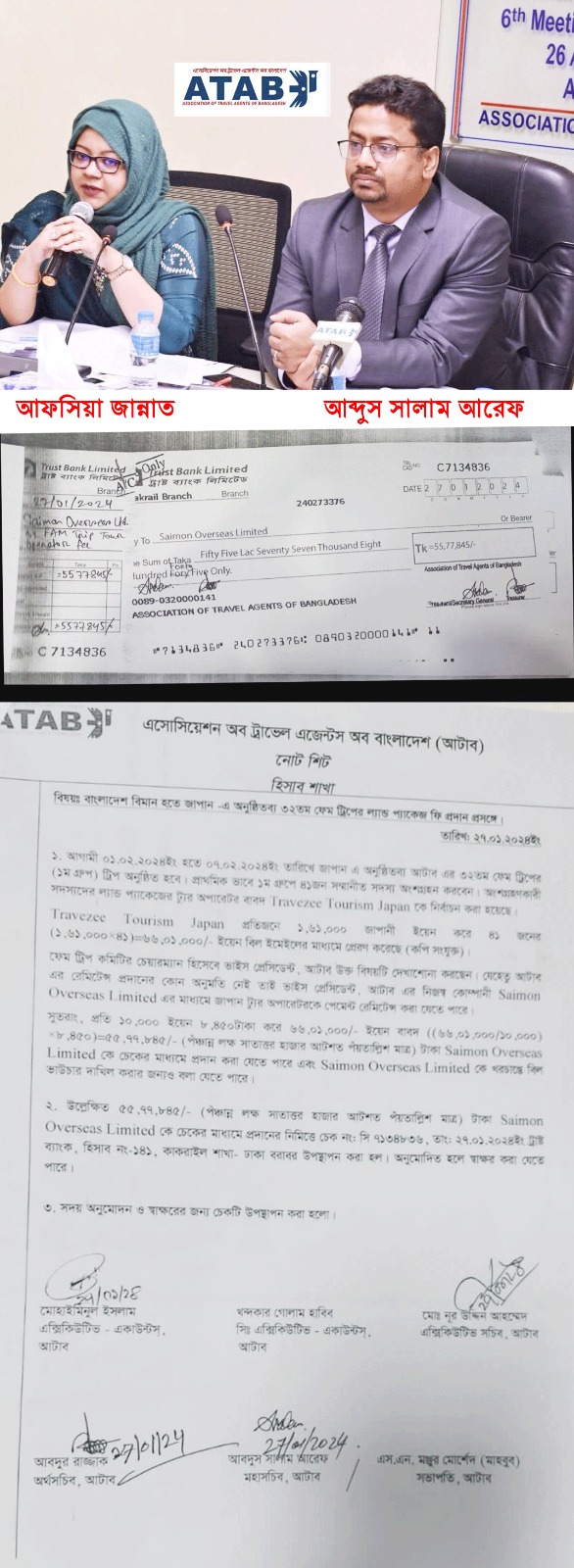 এছাড়াও জাপান ফেম ট্রিপের ৫৫,৭৭,০০০/০০ পঞ্চান্ন লক্ষ সাতান্ন হাজার টাকা পতিত আটাব কমিটির মহাসচিব আফসিয়া জান্নাত সালেহ এর নিজস্ব প্রতিষ্ঠান সায়মন ওভারসীজ লিমিটেডের নামে চেক ইস্যু করে আত্বসাত করেছে বলে প্রমাণ পাওয়া গেছে। আটাব অনলাইনের প্রায় ১ কোটি ৫০ লক্ষ টাকা দূর্নিতিবাজ সভাপতি আব্দুস সালাম আরেফ ও মহাসচিব আফসিয়া জান্নাত সালেহ আত্মসাৎ করেছে। উক্ত অভিযোগগুলো প্রমানিত হওয়ায় আটাব কমিটি বাতিল করে বানিজ্য মন্ত্রণালয়ের উপসচিব জনাব মোতাকাব্বির আহমেদকে প্রশাসক নিয়োগ করেছে বানিজ্য মন্ত্রণালয়।