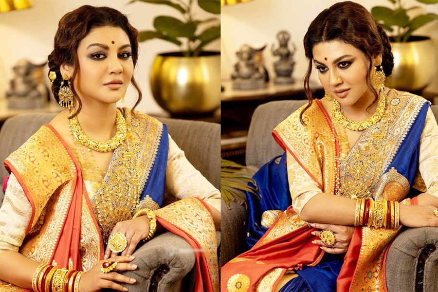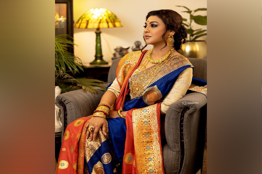 ছবিগুলোতে জয়াকে দেখা গেছে নীল ও কমলা বর্ণের সোনালি কারুকাজের শাড়িতে, যা ফুটিয়ে তুলেছে রাজকীয় আবহ। গলায় ভারী গয়না, হাতে চুড়ি, কানে ঝুমকা-সব মিলিয়ে এক পরিপূর্ণ বাঙালি কনের সাজে ধরা দিয়েছেন তিনি। মানানসই চুলের বাঁধন ও হালকা মেকআপ যেন জয়াকে আরও অনন্য করে তুলেছে।