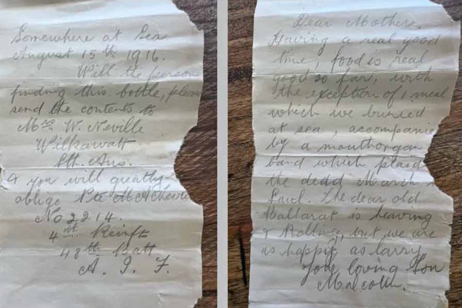 অস্ট্রেলিয়ার দক্ষিণ-পশ্চিম উপকূলে শত বছর পর ভেসে এসেছে ওয়েস্টার্ন অস্ট্রেলিয়ার হোয়াইটন সৈকতে বালুর নিচে চাপা থাকা বোতলবন্দি চিঠি সম্প্রতি আবিষ্কৃত হয়েছে। চিঠিতে প্রথম বিশ্বযুদ্ধে অংশ নেওয়া দুই অস্ট্রেলিয়ান সৈন্যের লেখা উল্লসিত দিনগুলোর