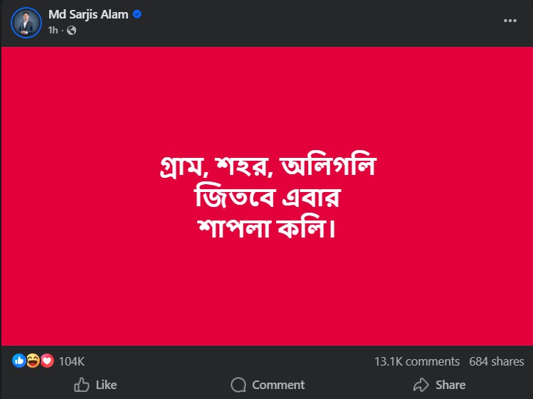 জাতীয় নাগরিক পার্টির (এনসিপি) উত্তরাঞ্চলের মুখ্য সমন্বয়ক সারজিস আলম নির্বাচনে নিজেদের দলীয় প্রতীক ‘শাপলা কলি’ নিয়ে সামাজিক যোগাযোগমাধ্যমে পোস্ট করেছেন।