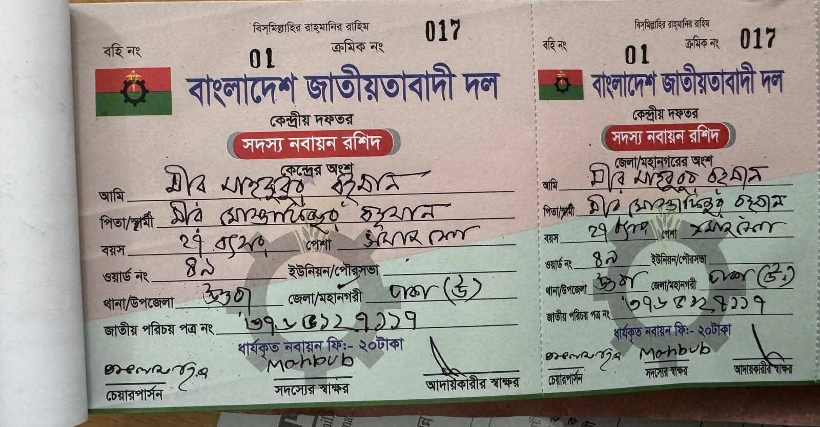 মীর মাহবুবুর রহমান স্নিগ্ধ বিএনপির প্রাথমিক সদস্যপদ সংগ্রহ করেছেন। ছবি: ভিওডি বাংলা