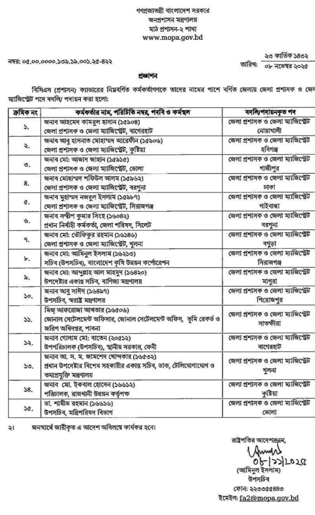 ঢাকাসহ ১৫ জেলায় নতুন ডিসি নিয়োগ