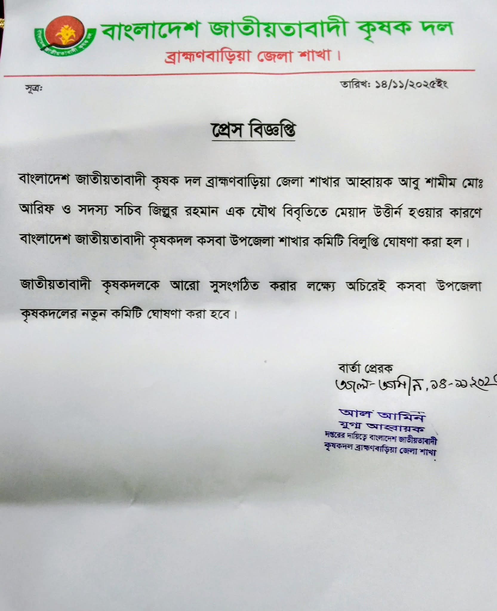 বাংলাদেশ জাতীয়তাবাদী কৃষকদল ব্রাহ্মণবাড়িয়া জেলা শাখার আহ্বায়ক আবু শামীম মোঃ আরিফ এবং সদস্য সচিব জিল্লুর রহমান এক যৌথ বিবৃতিতে বাংলাদেশ জাতীয়তাবাদী কৃষকদল কসবা উপজেলা শাখার বর্তমান কমিটি বিলুপ্ত ঘোষণা করেছেন।