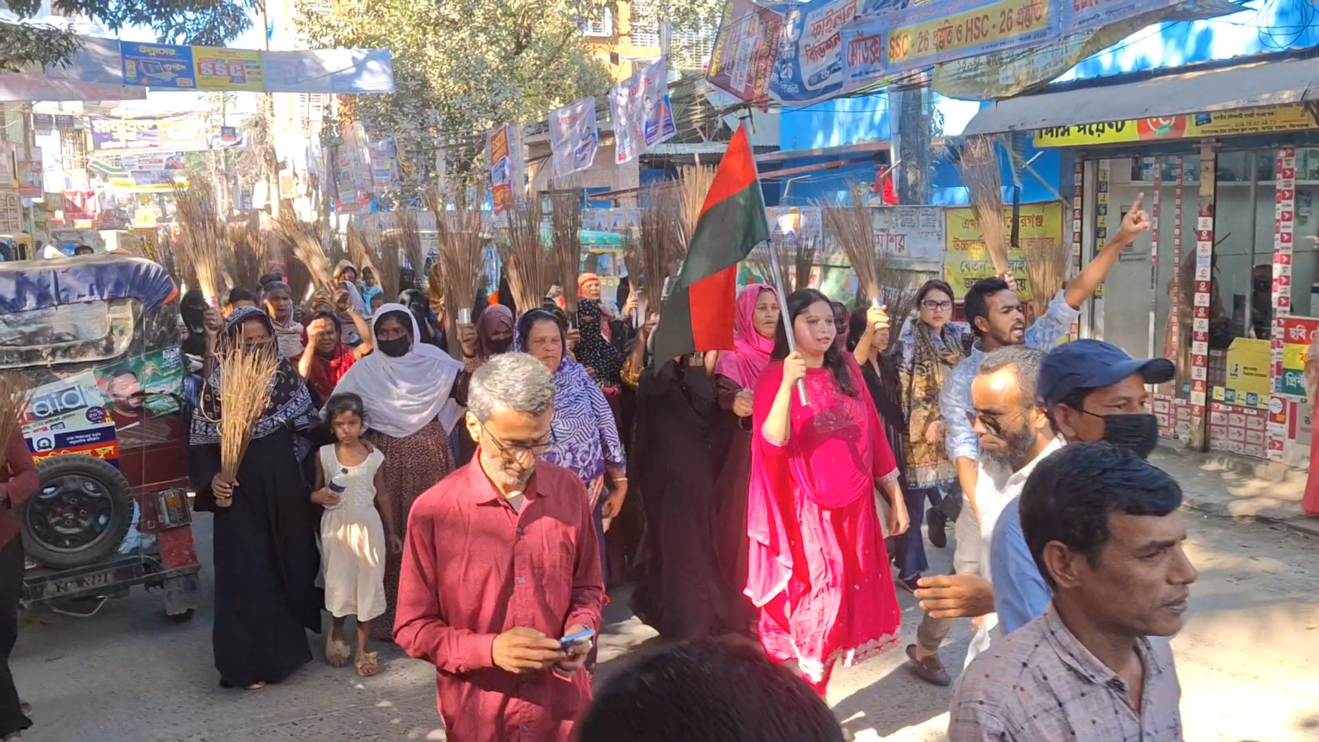 মহিলাদের ঝাড়ু মিছিল মাজহারুল ইসলামের মনোনয়ন বাতিল দাবিতে