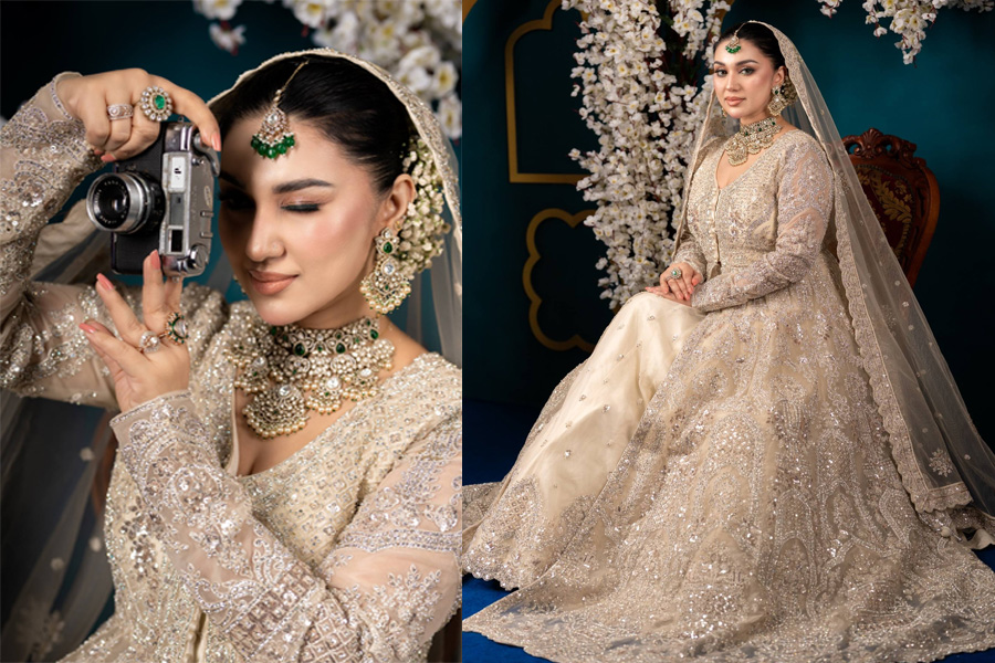 ছবিতে দেখা যায়, মসলিন শুভ্র সাদার পোশাকে রুপালি জারদৌসি কাজের লেহেঙ্গা পরেছেন। এর ওপর ছিল ফ্লোর টাচ গাউন কোটি। পোশাকের সঙ্গে ওড়নাও ছিল কারুকার্যে পরিপূর্ণ।