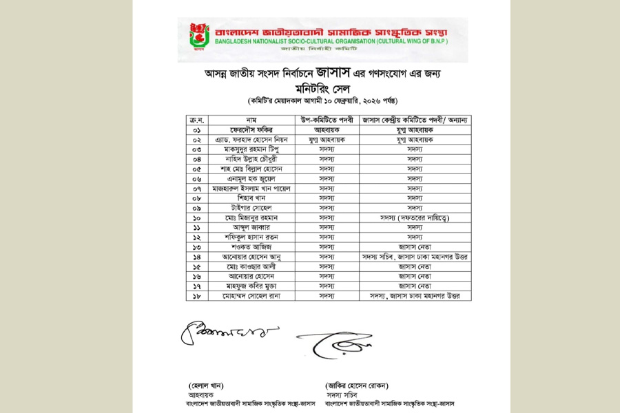 আসন্ন জাতীয় সংসদ নির্বাচনে গণসংযোগ কার্যক্রম জোরদারে বাংলাদেশ জাতীয়তাবাদী সামাজিক সাংস্কৃতিক সংস্থা (জাসাস) কেন্দ্রীয় কমিটির উদ্যোগে একটি মনিটরিং সেল গঠন করা হয়েছে। এ কমিটির মেয়াদ নির্ধারণ করা হয়েছে ১০ ফেব্রুয়ারি ২০২৬ পর্যন্ত।