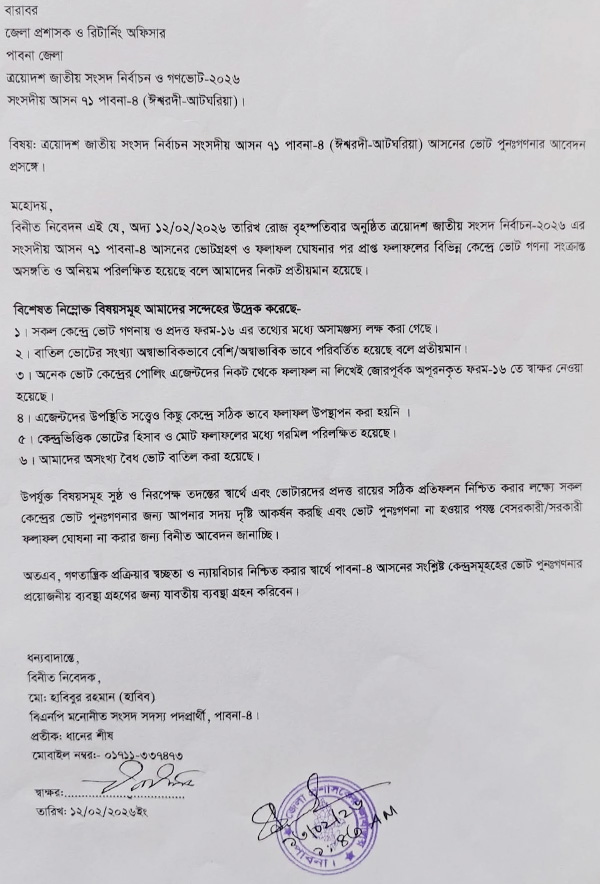 জেলা প্রশাসক ও রিটার্নিং কর্মকর্তার কাছে দেওয়া লিখিত আবেদনে হাবিবুর রহমান দাবি করেন, গত ১২ ফেব্রুয়ারি অনুষ্ঠিত নির্বাচনের ভোটগ্রহণ ও ফলাফল ঘোষণার পর বিভিন্ন কেন্দ্রে ভোট গণনা সংক্রান্ত অসঙ্গতি ও অনিয়ম পরিলক্ষিত হয়েছে।