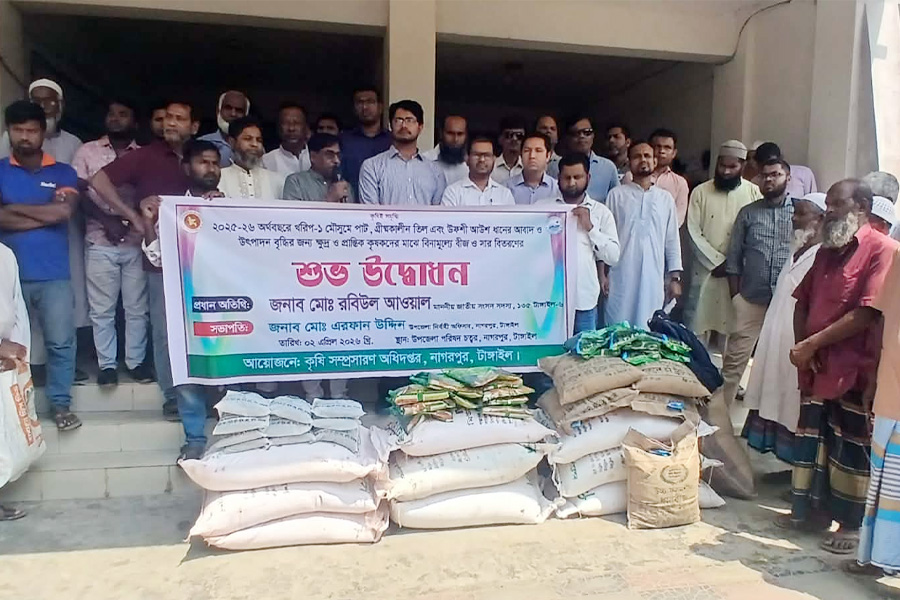 টাঙ্গাইলের নাগরপুরে চলতি অর্থবছরে খরিপ-১ মৌসুমে পাট, গ্রীম্মকালীন তিল এবং উফসী আউশ ধানের আবাদ ও উৎপাদন বৃদ্ধির লক্ষ্যে ক্ষুদ্র ও প্রান্তিক ১০৫০ জন কৃষকের মাঝে বিনামূল্যে পাট ও তিল বীজ এবং সার বিতরণ করা হয়েছে।